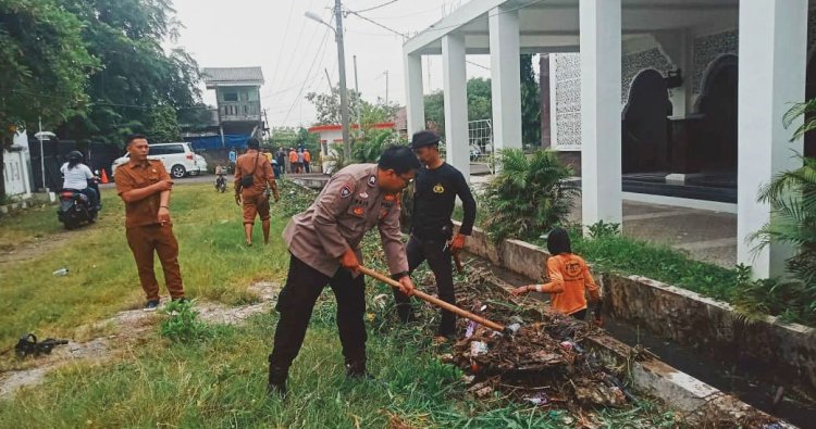 Selanjutnya dipimpin Bhabinkamtibmas, perangkat desa dan warga membersihkan sampah dan rumput yang menutupi saluran air disekitar lingkungan kantor Desa