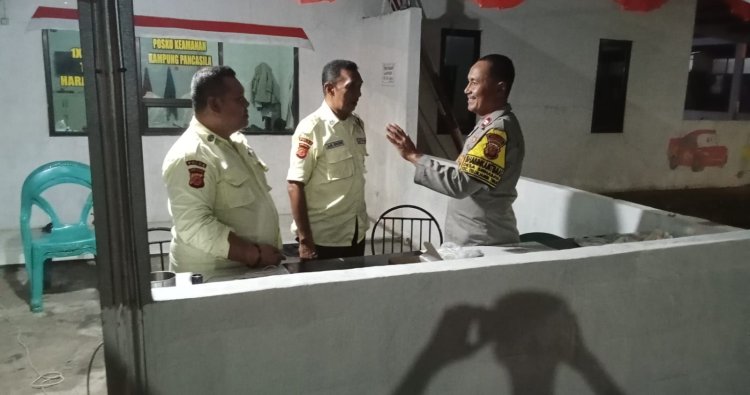 Polres Karawang - Bhabinkamtibmas Polsek Telukjambe Timur, Aiptu M. Ali sambangi warga di Posko Satkamling Kampung Pancasila Desa Sirnabaya, Kecamatan Telukjambe Timur, Kabupaten Karawang, Selasa (21/10/2025) malam.