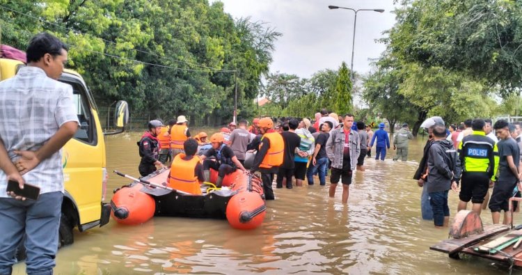 Brimob Polda Aceh Kompi 1 Batalyon B yang bertugas di Lhokseumawe membantu mengevakuasi masyarakat dari lokasi banjir di Kecamatan Simpang Pelabuhan Krueng Geukueh dan Muara Satu, Kota Lhokseumawe, Kamis, 27 November 2025, kemarin.