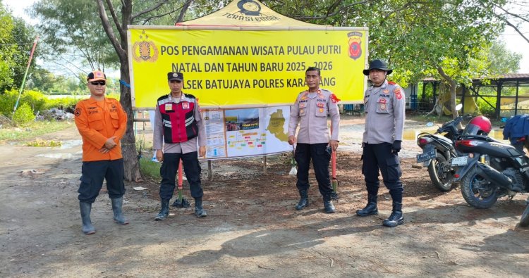 Termasuk personel kepolisian dari sektor Batujaya Polres Karawang yang melaksanakan Giat PAM Nataru Lodaya 2025/2026 di Pos Objek Wisata Pulau Putri Cikeong Batujaya. Jumat (26/12/2025)