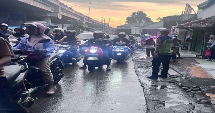 Guna Kelancaran, Personil Polsek Cikampek Gatur Lalin Ditengah Hujan
