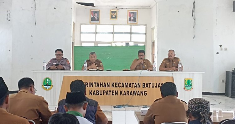 Polres Karawang - Polsek Batujaya Polres Karawang Polda Jabar, Kanit Sabhara Polsek Batujaya Polres Karawang Aiptu Dadang Suhendar mewakili Kapolsek Batujaya Akp H Ruslani mengikuti Rapat Minggon di Aula Kecamatan Batujaya serta menyampaikan Arahan dan Himbauan. Selasa (9/12/2025).