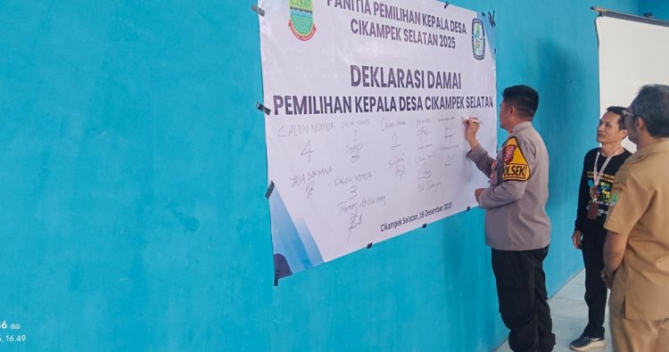 Dalam rangka meningkatkan pelayanan dan kondusifitas di wilkum Połsek Cikampek Kapolsek Cikampek AKP Aji Setiaji bersama Anggota Monitoring dan ikuti langsung kegiatan Rapat pleno daftar pemilihan tetap (DPT) dan Deklarasi Damai pemilihan kepala Desa. Cikampek Selatan Kec.Cikampek Kab.Karawang periode 2026-2034.