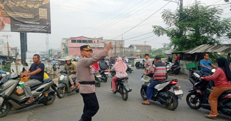 Polres Karawang - Guna memberikan pelayanan prima kepada masyarakat di pagi hari, Kapolsek Rengasdengklok Polres Karawang Kompol H.Edi Karyadi S.H bersama anggota turun langsung melaksanakan kegiatan pengaturan lalu lintas di pertigaan Jalan raya Pasar lama Rengasdengklok,