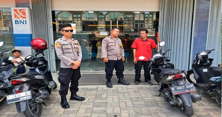 Dalam kegiatan patroli, personil menyisir jalan raya proklamasi dan Sambangi Kantor Bank BNI Rengasdengklok desa Rengasdengklok Selatan Kec.Rengasdengklok