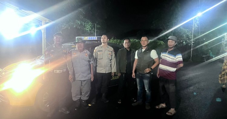 Patroli Polsek Cikampek Pantau Jalur Jalan Pewarengan Cikampek sembari sambang pesan kantibmas Linmas dan Satkamling di desa Karangsinom yang sedang melaksanakan Ronda Malam , kegiatan digelar pada 13 Januari 2026 sekira Pukul 01: 30 WIB .