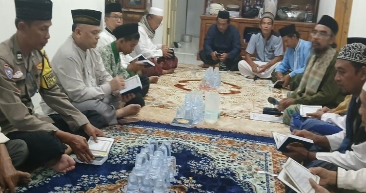 Bhabinkamtibmas Polsek Telukjambe Timur, Aiptu Diayanto bersama warga menghadiri pengajian yasinan 40 hari meninggalnya salah satu warga di Dusun Sukatani RT 10/04 Desa Pinayungan, Telukjambe Timur, Karawang.