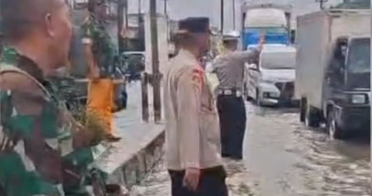 Di lokasi banjir, Kapolsek Klari Kompol H Bambang Sumitro.SH., MM., CHRA bersama Kanit Lantas AKP Ali Idrus dan anggota Połsek Klari Polres Karawang melakukan pengaturan lalu lintas, membantu pengendara melewati genangan air, serta memberikan imbauan agar tetap berhati-hati ketika melintas di jalur rawan.